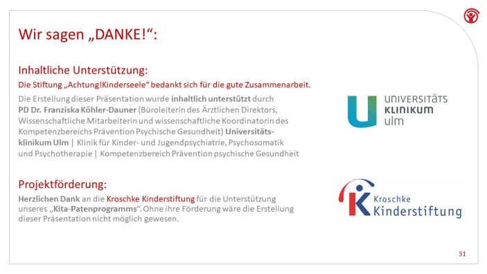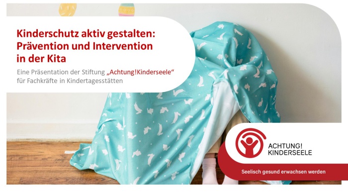 Diese kommt in Webseminaren der Stiftung für Erzieherinnen und Erzieher zum Einsatz und soll diese unter anderem dazu befähigen, Anzeichen von Vernachlässigung oder Gewalt zu erkennen und richtig darauf zu reagieren. Insgesamt wird die Stiftung „Achtung!Kinderseele“, von der Kinderstiftung mit 10.000 Euro unterstützt.